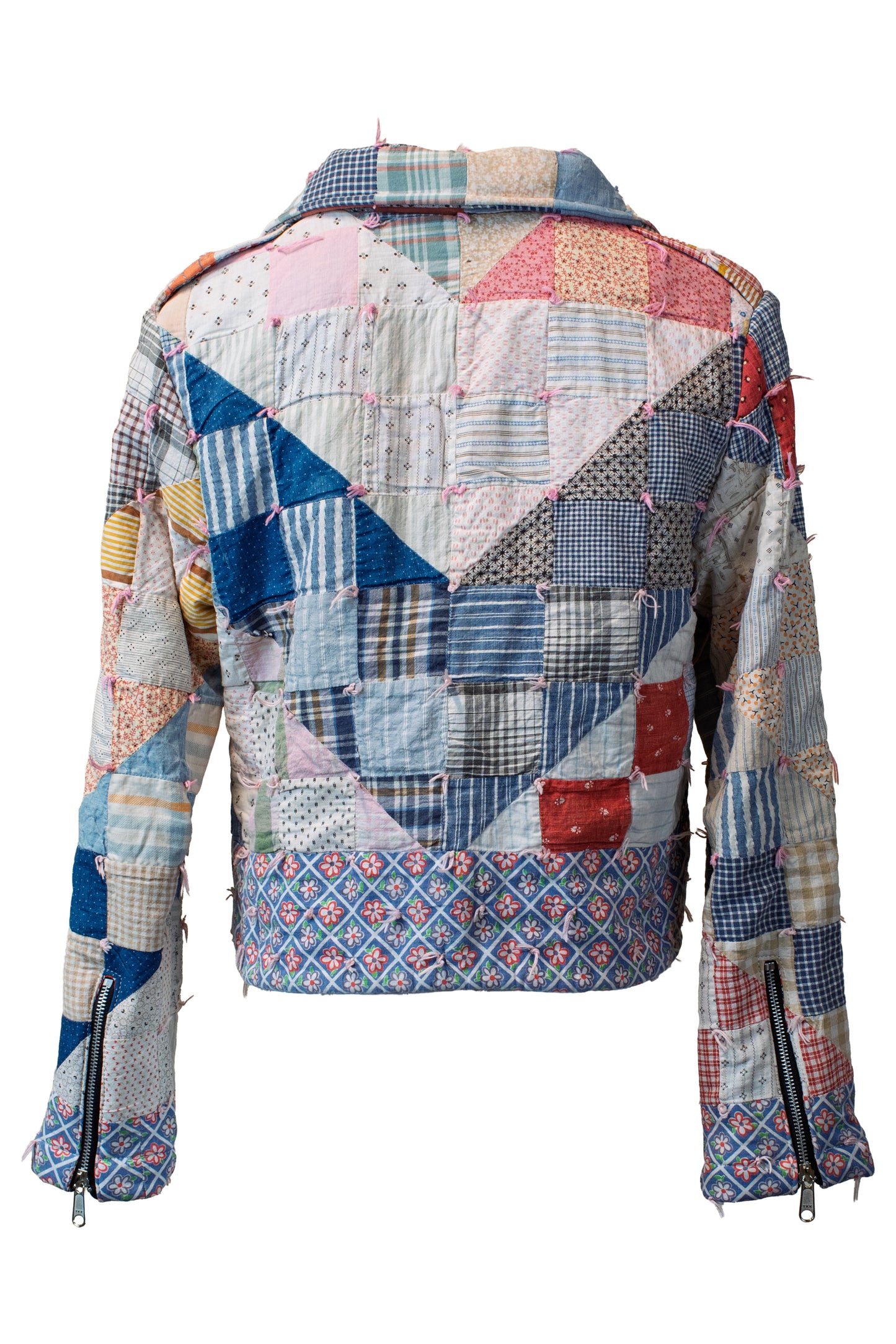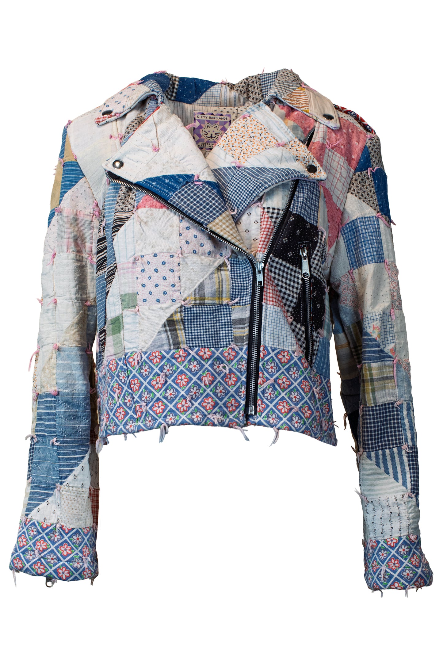 Made from repurposed vintage quilts, the Cropped Adeline Quilted Biker Jacket by Kitty Badhands is a bold, one-of-a-kind layer with serious attitude. Inspired by Adeline Van Buren, the first woman to motorcycle across the U.S. in 1916, this jacket is where vintage charm meets biker edge.